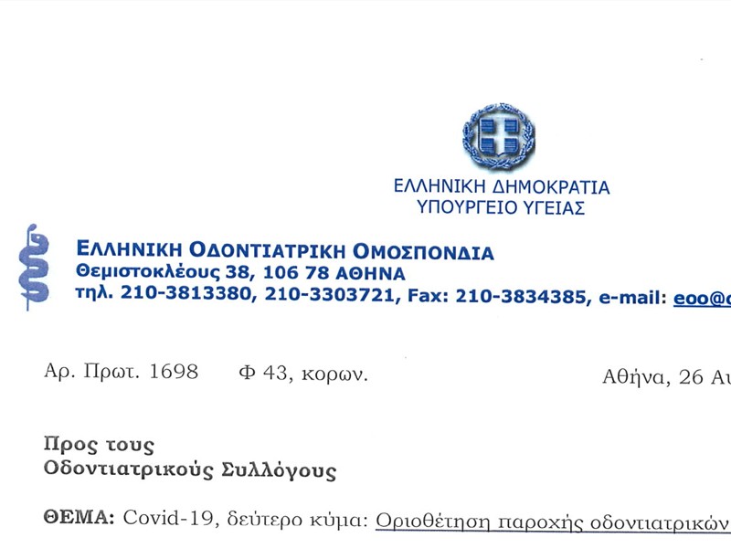 Επικαιροποιημένες οδηγίες προς οδοντιάτρους, εργαζομένους σε οδοντιατρεία και ασθενείς 03 Αυγούστου 2021 Εμφανίσεις: 1451 ΑΡΧΕΙΟ ΣΕ PDF